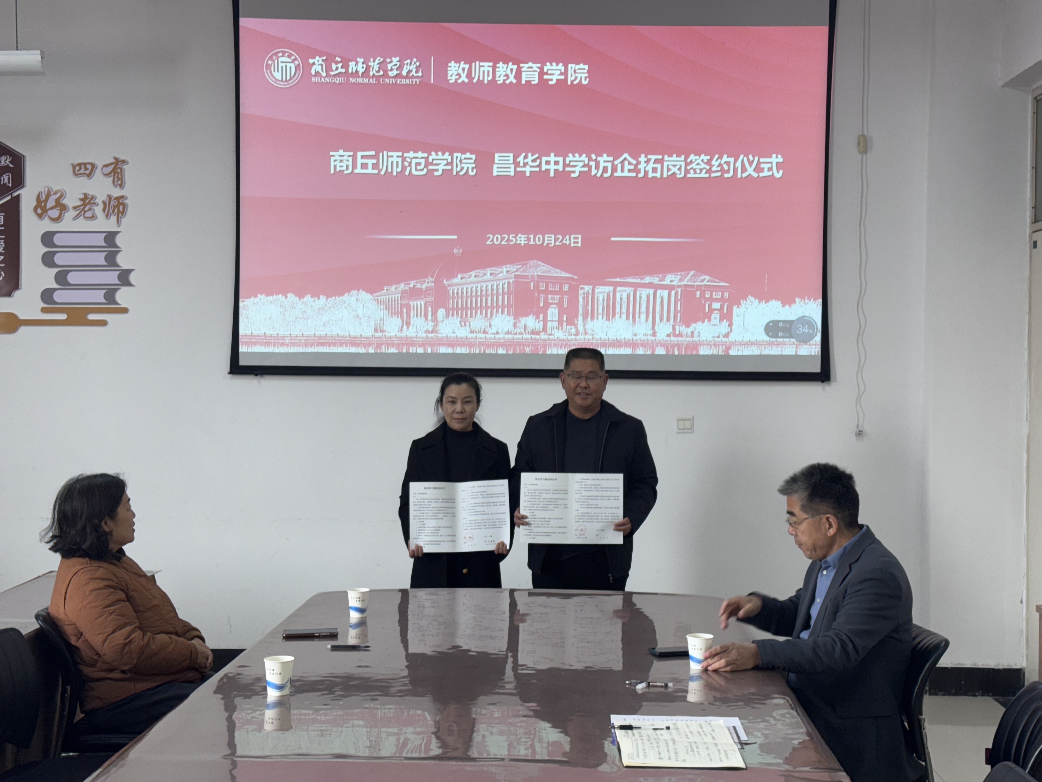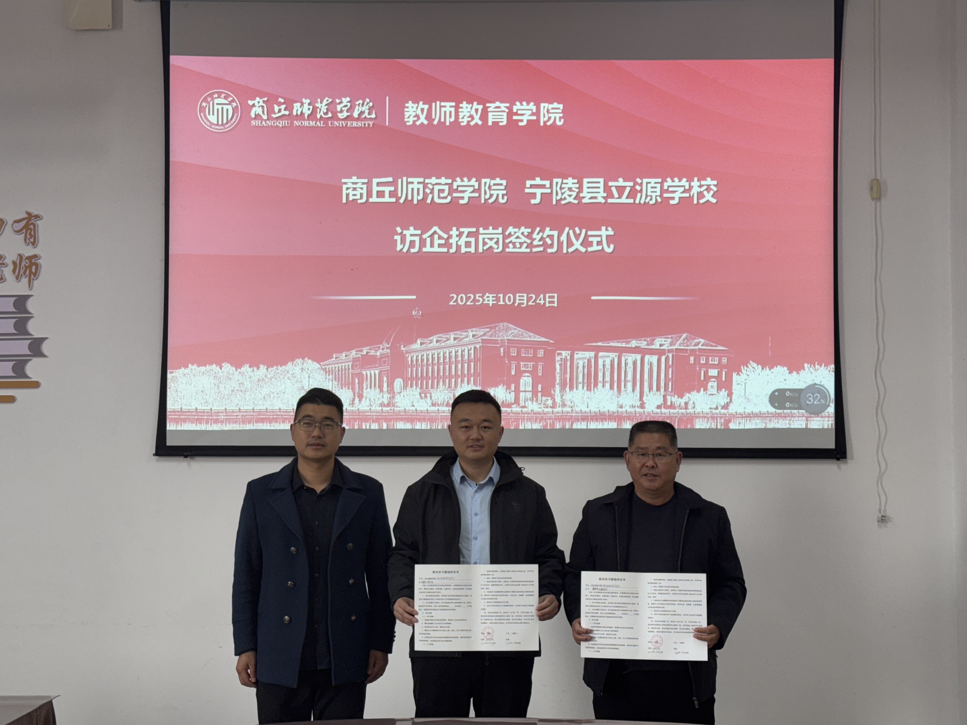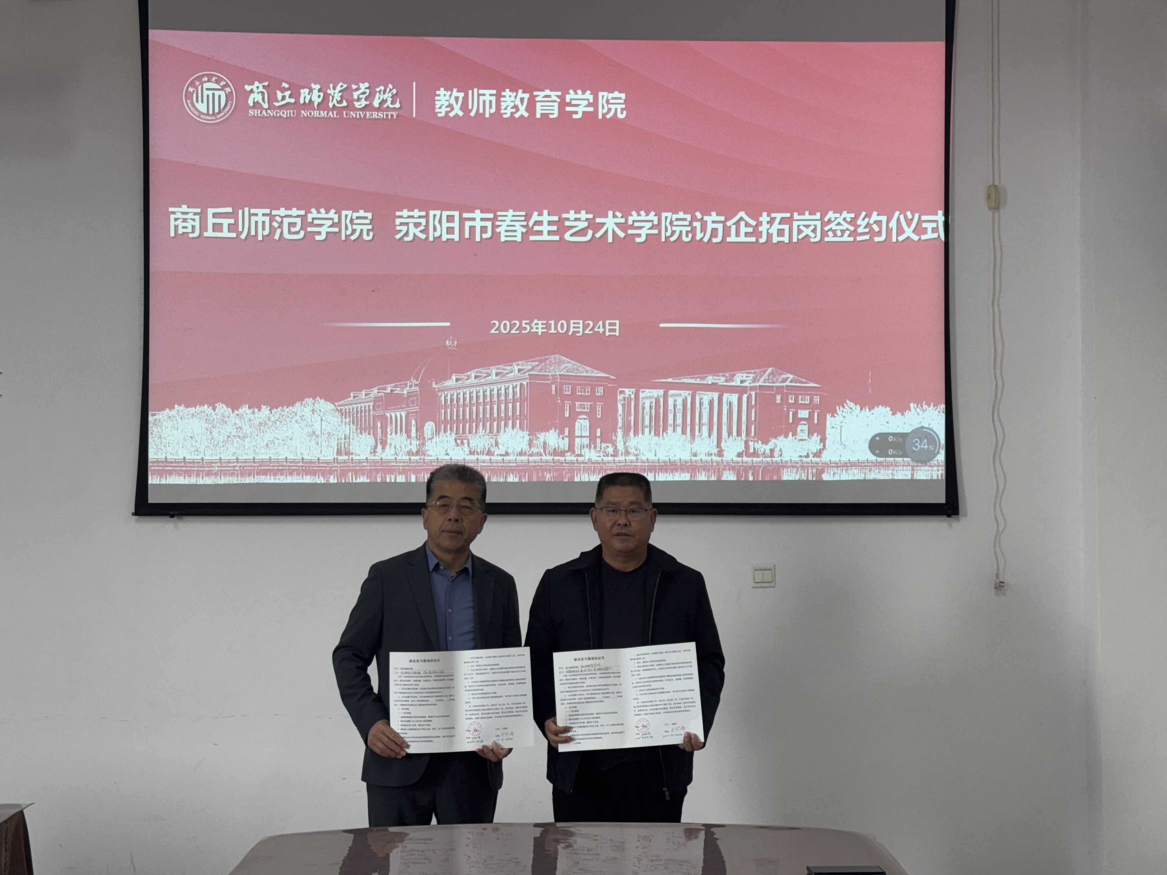 10月24日,2138CC太阳集团以2138cn太阳集团古天乐2026届毕业生秋季双向选择洽谈会为契机,于汉梁楼203会议室开展访企拓岗促就业专项行动。学院邀请商丘市示范区昌华中学、宁陵县立源学校、荥阳春生艺术学校三家单位来我院商谈毕业生实习就业校企合作项目,党委副书记邱友谊、毕业班辅导员朱冠宇以及三家单位相关负责人参加签约仪式。