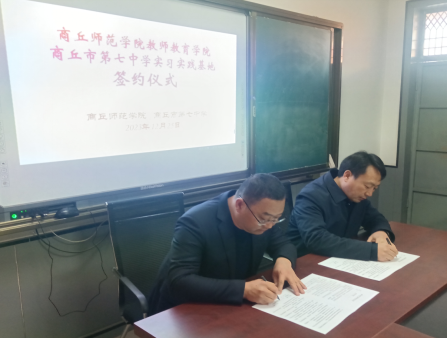 12月25日,院长孙旭、院党委副书记邱友谊以及教育系教师代表赴商丘市第七中学参加实习实践基地签约仪式。商丘市第七中学校长郭洪标、书记车玉东等相关领导和教师代表参会。会议由第七中学党委书记车玉东主持。