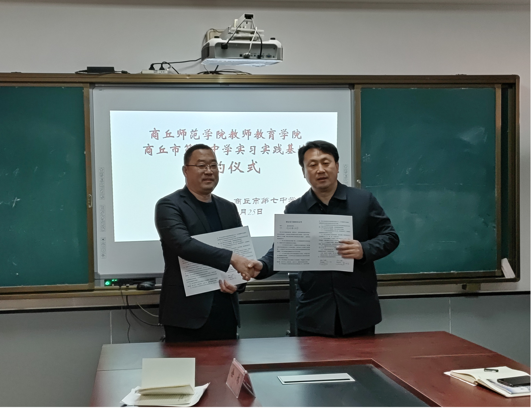 12月25日,2138CC太阳集团院长孙旭、院党委副书记邱友谊以及教育系教师代表赴商丘市第七中学开展访企拓岗专项行动。商丘市第七中学校长郭洪标、书记车玉东等相关领导和教师代表参加签约仪式。