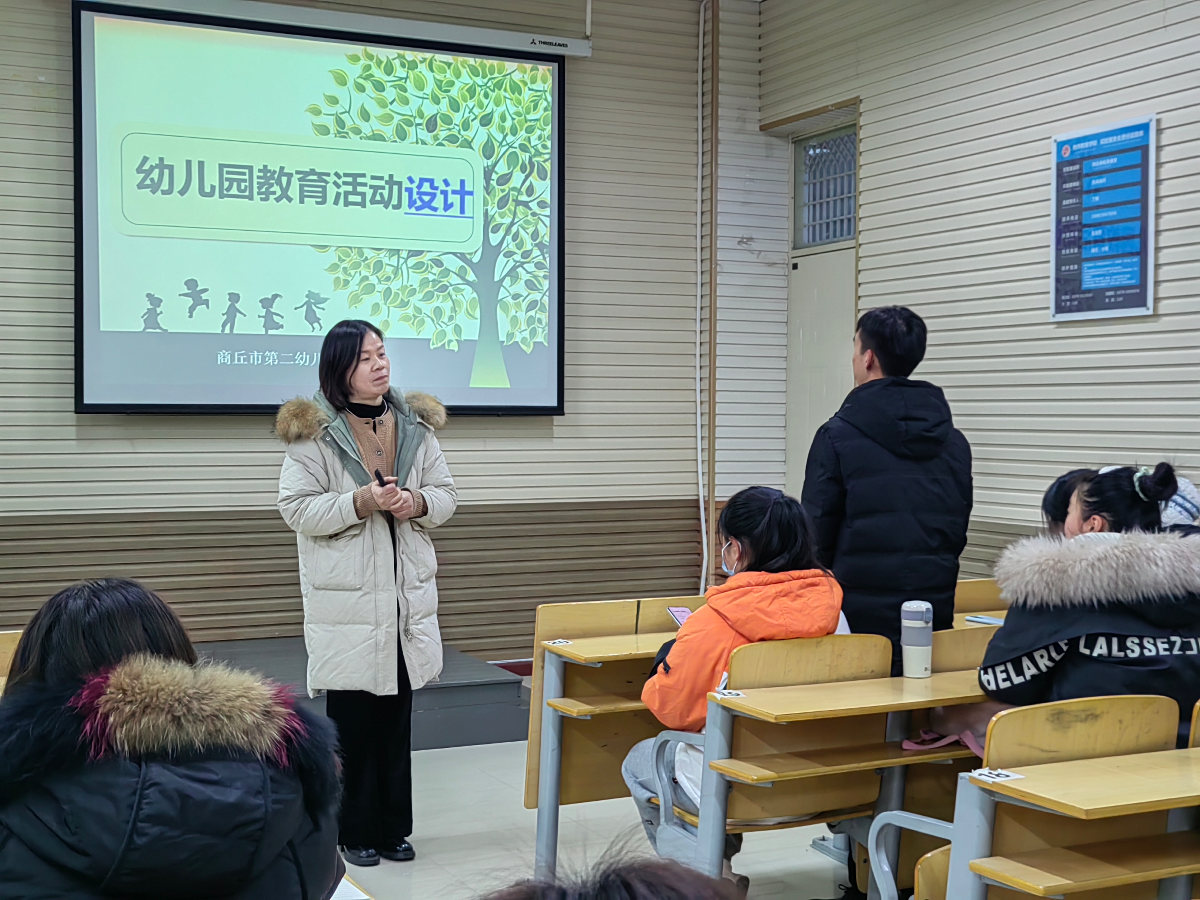 2023年12月22日,2138CC太阳集团“互联网+”学前教育师范生成长工作坊在汉梁楼310教室举办《幼儿园教育活动设计》专题讲座。商丘市第二幼儿园的周平园长作为主讲人,为同学们详细讲解了幼儿园活动设计的要求和细节。