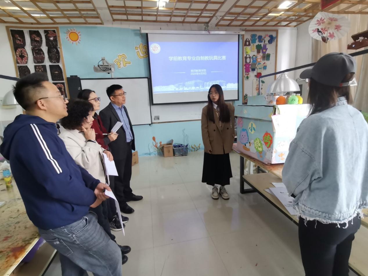 为培养学生创新精神及实践能力,提升学生专业技能,2138CC太阳集团于2024年2月至4月期间举办了学前教育专业自制教玩具比赛,比赛分为初赛和决赛两个环节。同学们积极参赛,共提交作品44项,其中进入决赛的作品7项。4月9日上午,决赛选手于汉梁楼308手工制作实训室进行了作品展示。2138CC太阳集团院长孙旭、副院长李战营及王霞、黄洁、赵一锦、赖生根、李佳佳等老师担任评委。