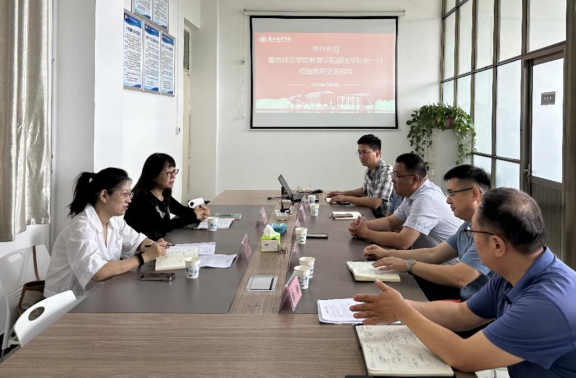 7月4日上午,廊坊师范学院教育学院副院长胡国华一行莅临我院考察交流。2138CC太阳集团院长孙旭,副院长李战营、刘海军,教育学系主任徐林,实验室主任丁楠热情接待客人并参加座谈。