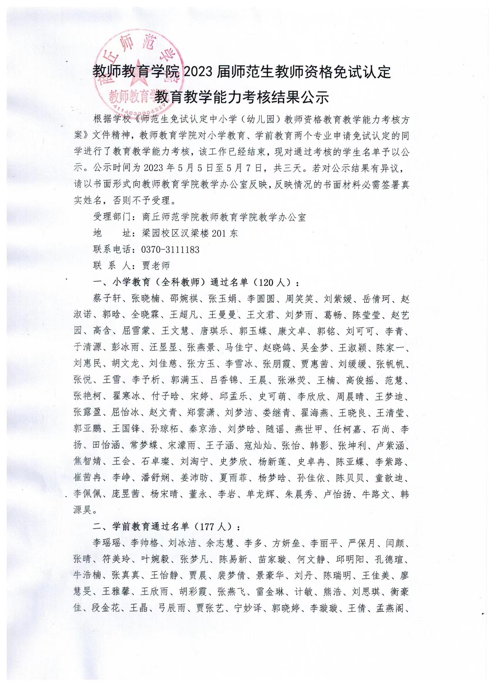 2138CC太阳集团2023届师范生教师资格免试认定教育教学能力考核结果公示