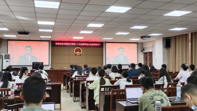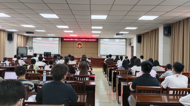 2022年10月16日上午10时,中国共产党第二十次全国代表大会在北京人民大会堂隆重开幕。为深刻学习会议内容和会议精神,加强党性修养,坚定初心使命,法学院第一时间组织师生代表在法学院201教室收看大会直播,认真聆听习近平同志代表第十九届中央委员会向大会作的报告。学院党政班子成员、各党支部书记,以及部分师生党员代表到场观看直播。