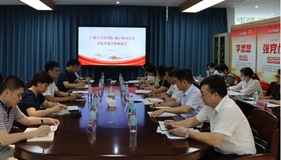 6月14日上午,南宁市司法局党组书记、局长黄有光一行到法学院调研指导,并与我院召开深化共建合作座谈会。院领导余云宇、邓惠英、陈刚,南宁市司法局副局长侯康顺、三级调研员邓琼冬等参加座谈。