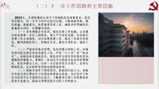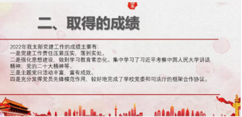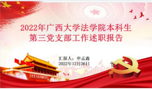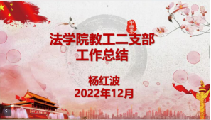 教职工第二党支部书记杨红波在其述职报告中主要就2022年工作的开展情况、取得的成绩、存在的问题、下阶段的工作思路和举措四大方面展开。教职工二支部通过全面从严治党,落实党建责任,强化思想教育建设,开展主题党日活动,提高党性修养,坚持求真务实,认真落实党建专项工作和课程思政等,在总结过去一年的成绩以及总结相关问题下,提出了相关举措:将进一步做好服务型党组织建设,落实“四位一体”管理方法和“党员固定日”制度及上好“三会一课”、民主评议、上党课制度;促进党建和业务工作融合发展,紧紧围绕学院中心,推动广西大学法学学科大发展;加强支部建设,提升支部党建科学化水平。