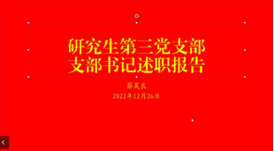 研究生第三党支部书记蔡昊良主要围绕支部基本情况、思想建设、组织纪律建设、“三会一课”、发展党员以及存在的相关问题及解决方案等方面展开。该支部每月的党日活动以思想建设为主,采取观看视频并撰写心得体会等形式展开。组织纪律建设方面坚持考勤并将其作为民主评议的参考。针对党性教育不足,支部队伍较大等问题指出将在未来的党建生活中注重组织纪律建设、加强党性修养、积极发展党员队伍。