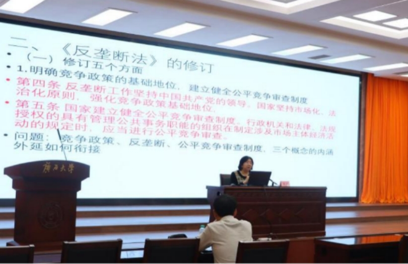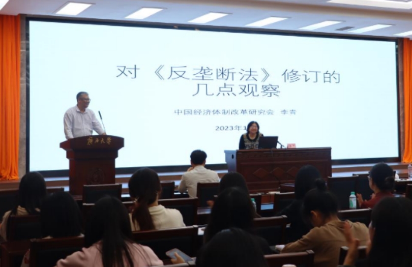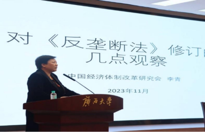 11月29日,中国经济体制改革研究会副会长李青应邀到我院作“对《中华人民共和国反垄断法》修订的几点观察”学术专题讲座。讲座由广西大学法学院院长许光耀主持。中国经济体制改革研究会产业政策和竞争政策专委会副主任梅丽鹏、广西大学法学院副院长董笃笃与谈,法学院教师代表、本科生、硕士研究生参加了本次讲座。