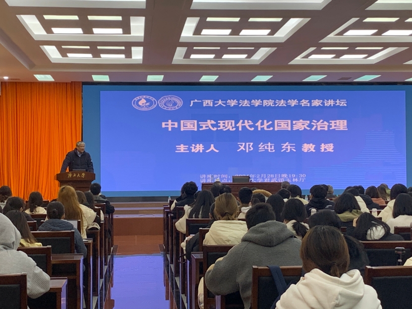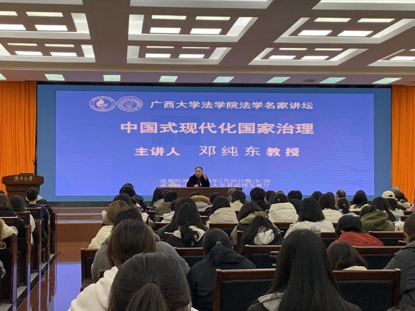 2月28日,第十三届全国政协委员、全国政协社会和法制委员会委员、中国政策科学研究会副会长邓纯东应邀在君武馆玉林厅作主题为“中国式现代化国家治理”的讲座。本次讲座由广西大学法学院院长许光耀主持,广西大学法学院本科生、硕士研究生参加了此次讲座。