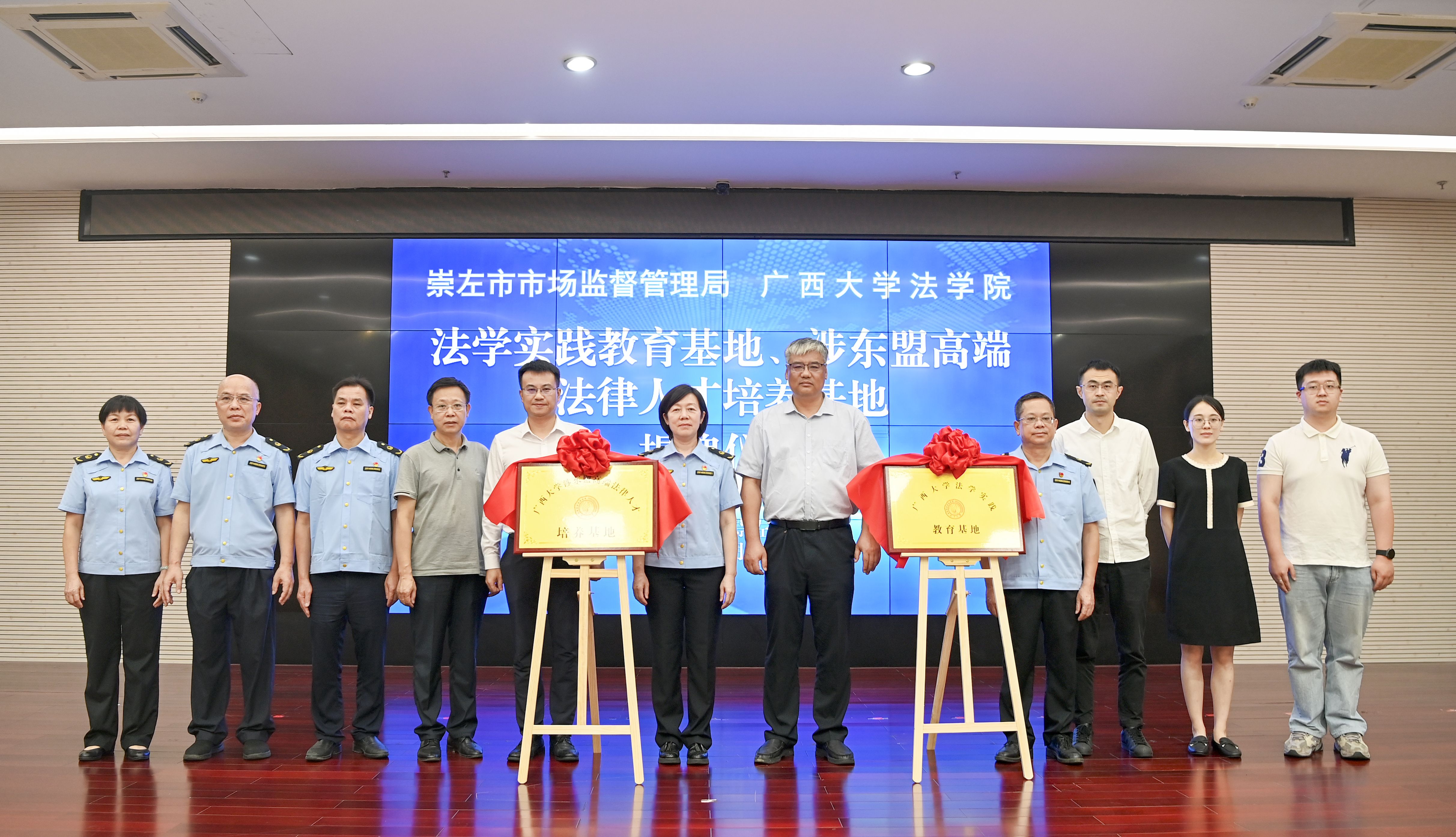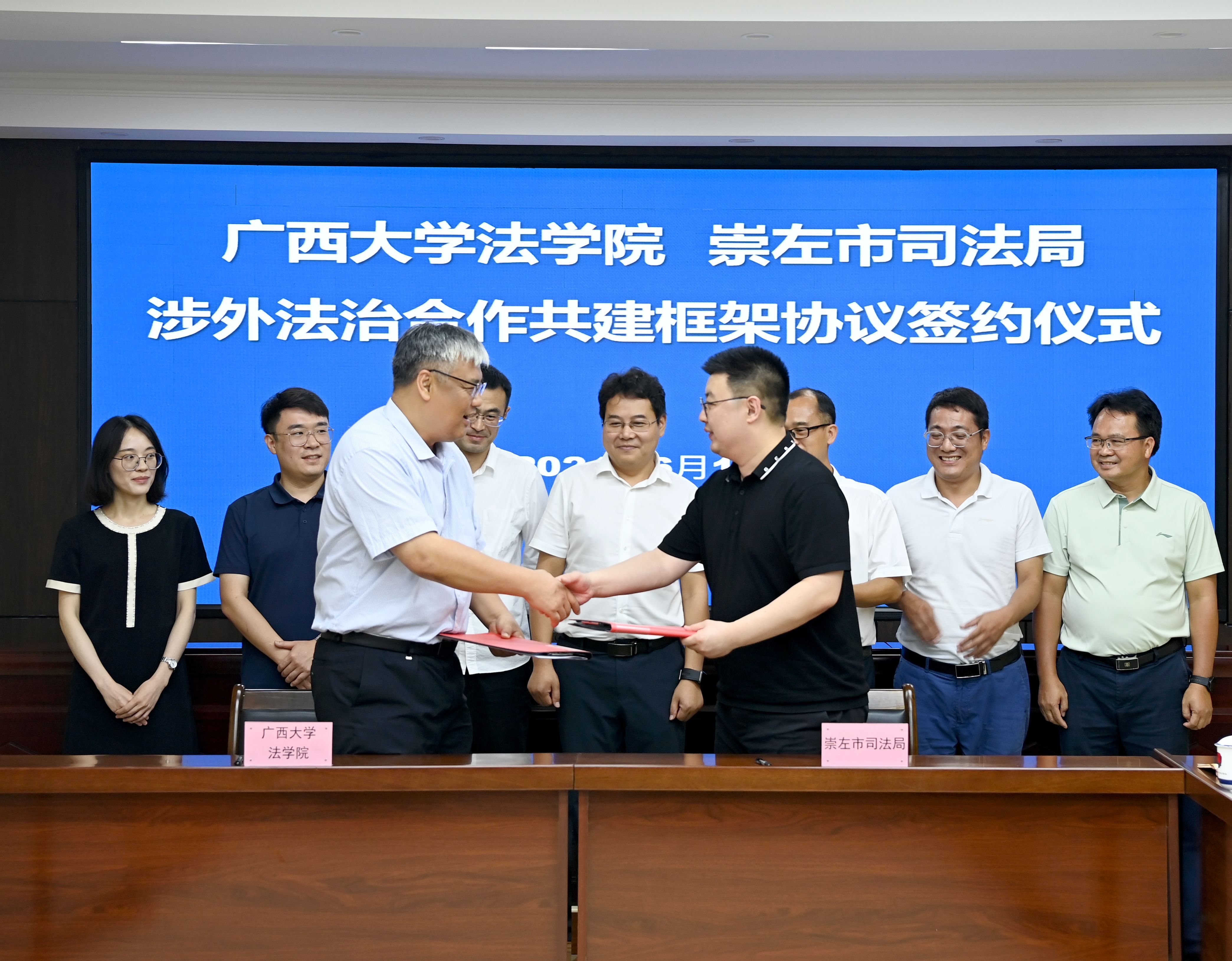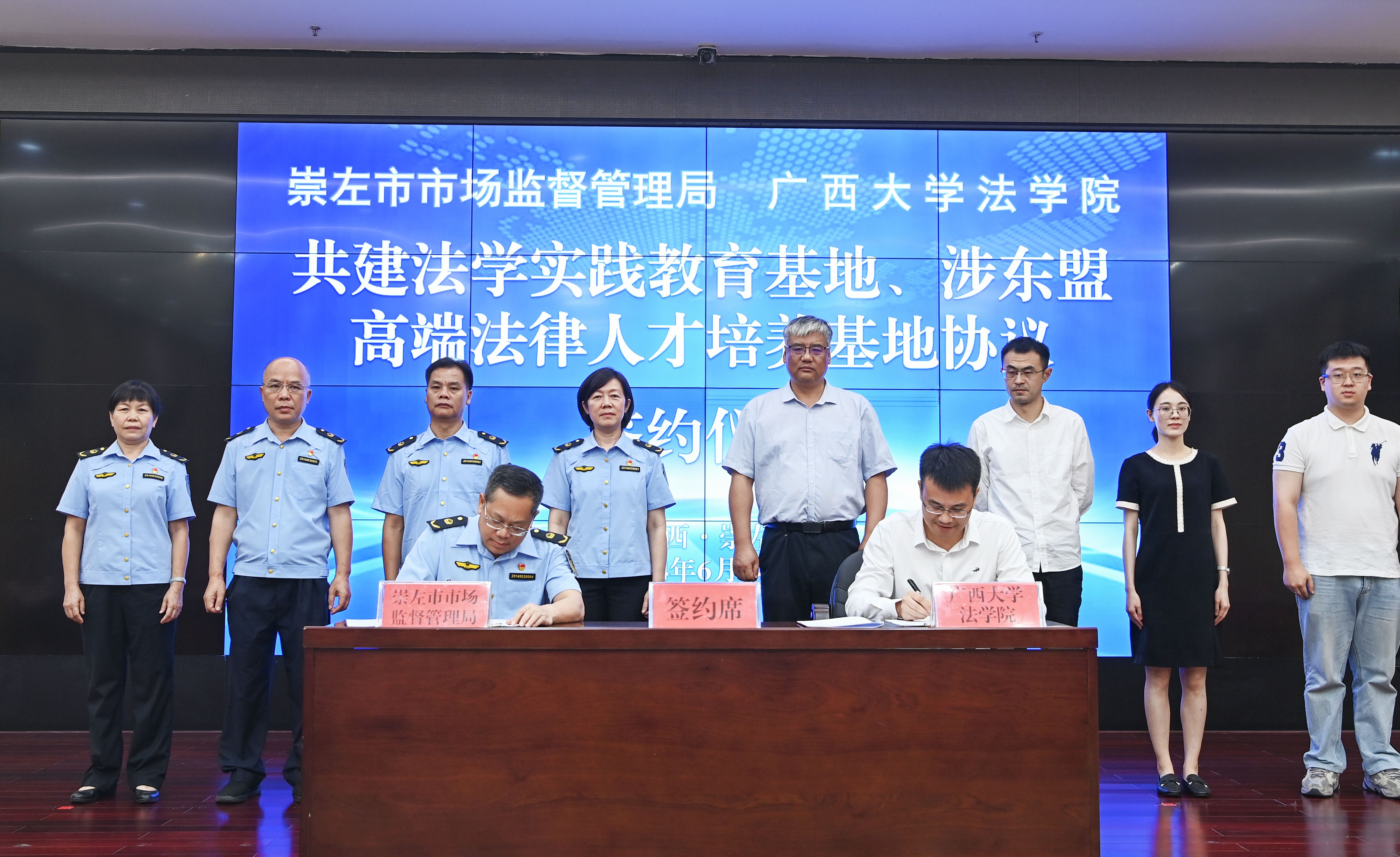 6月14日,我院分别与崇左市市场监督管理局、司法局签订共建广西大学“法学实践教育基地”及“涉东盟高端法律人才培养基地”协议并举行合作交流座谈。