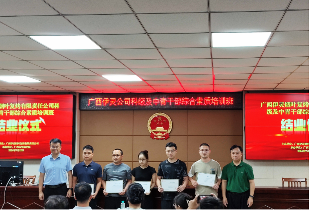 7月7日至12日,广西伊灵烟叶复烤有限责任公司科级及中青干部综合素质培训班在我院顺利举办。院领导余云宇、陈刚与伊灵公司人力资源处负责人张晓雪共同出席开班、结业仪式。