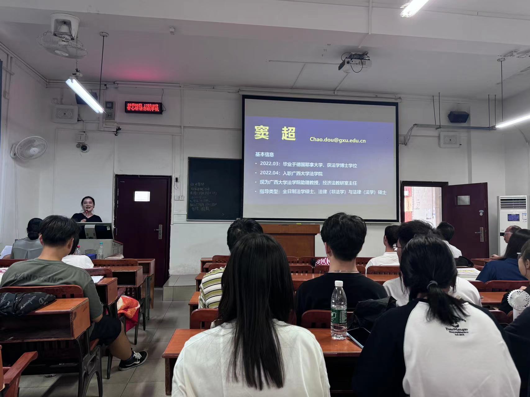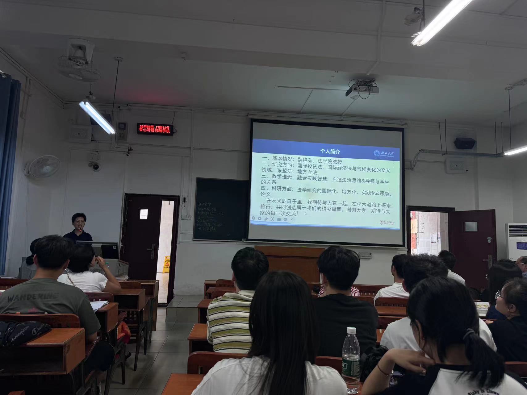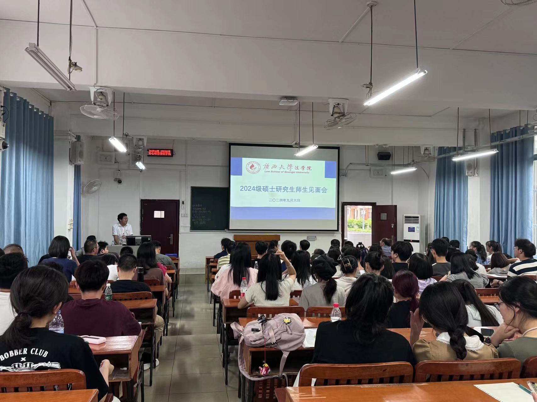 金秋送爽,新学期的生活也逐渐步入正轨。为使研究生新同学进一步了解学院的各位导师,促进师生双选工作的顺利推进,法学院于9月6日下午17:00在第二教学楼101教室召开2024年硕士研究生师生见面会。此次见面会由熊超副院长主持,到会导师分别上台简要介绍了自己的研究方向以及对招收学生的要求。最后,院长许光耀教授作了总结讲话,并对研一新生们的到来表达了期许和欢迎。因时间冲突,部分导师未能到达现场,但也都准备了个人简介PPT,由熊超副院长代为介绍。