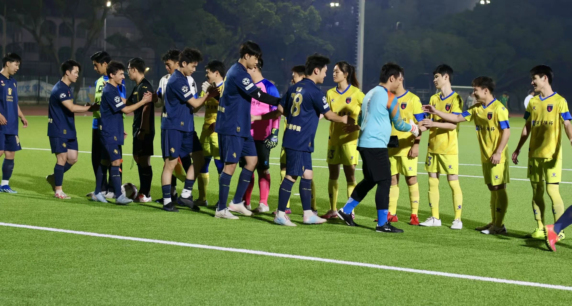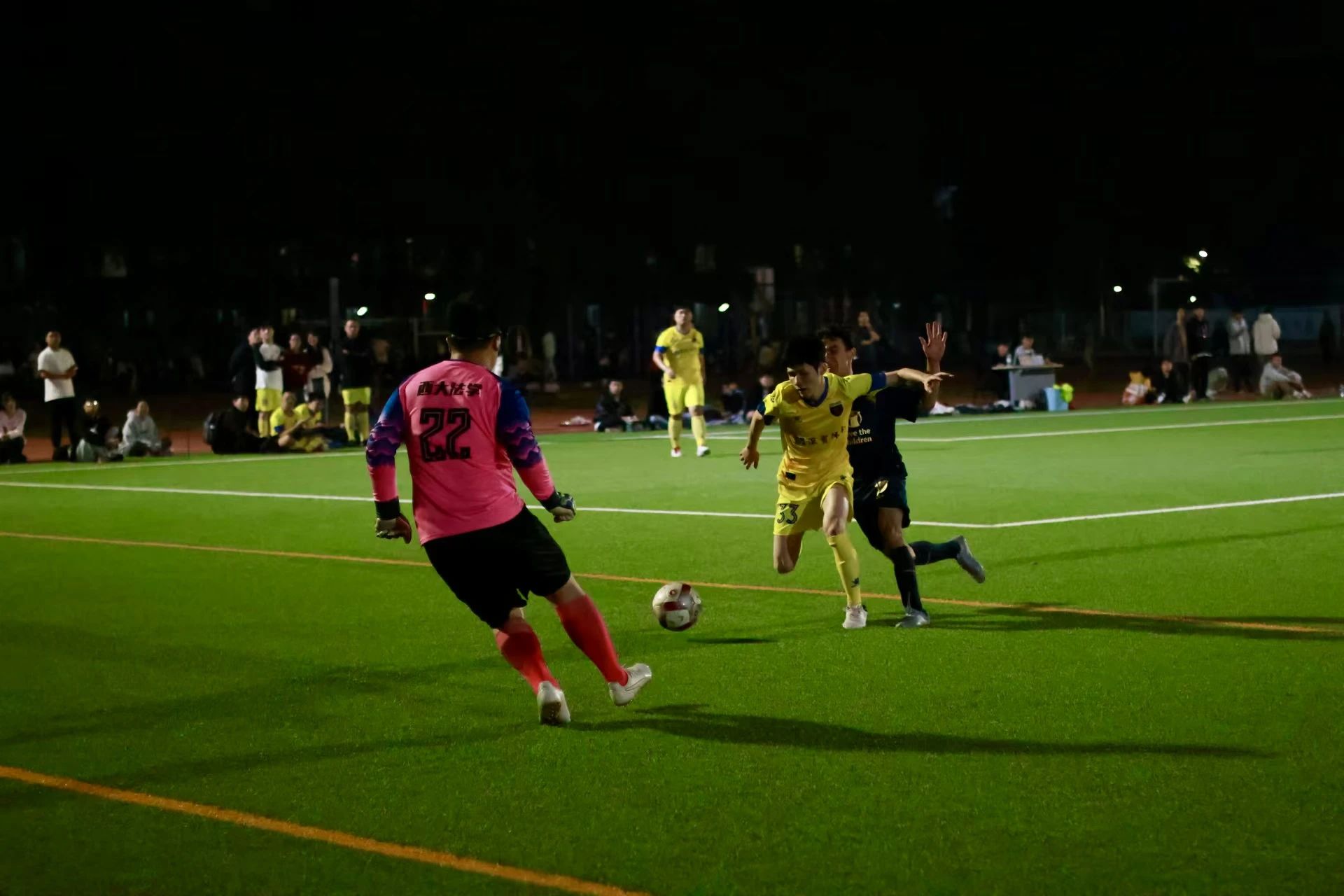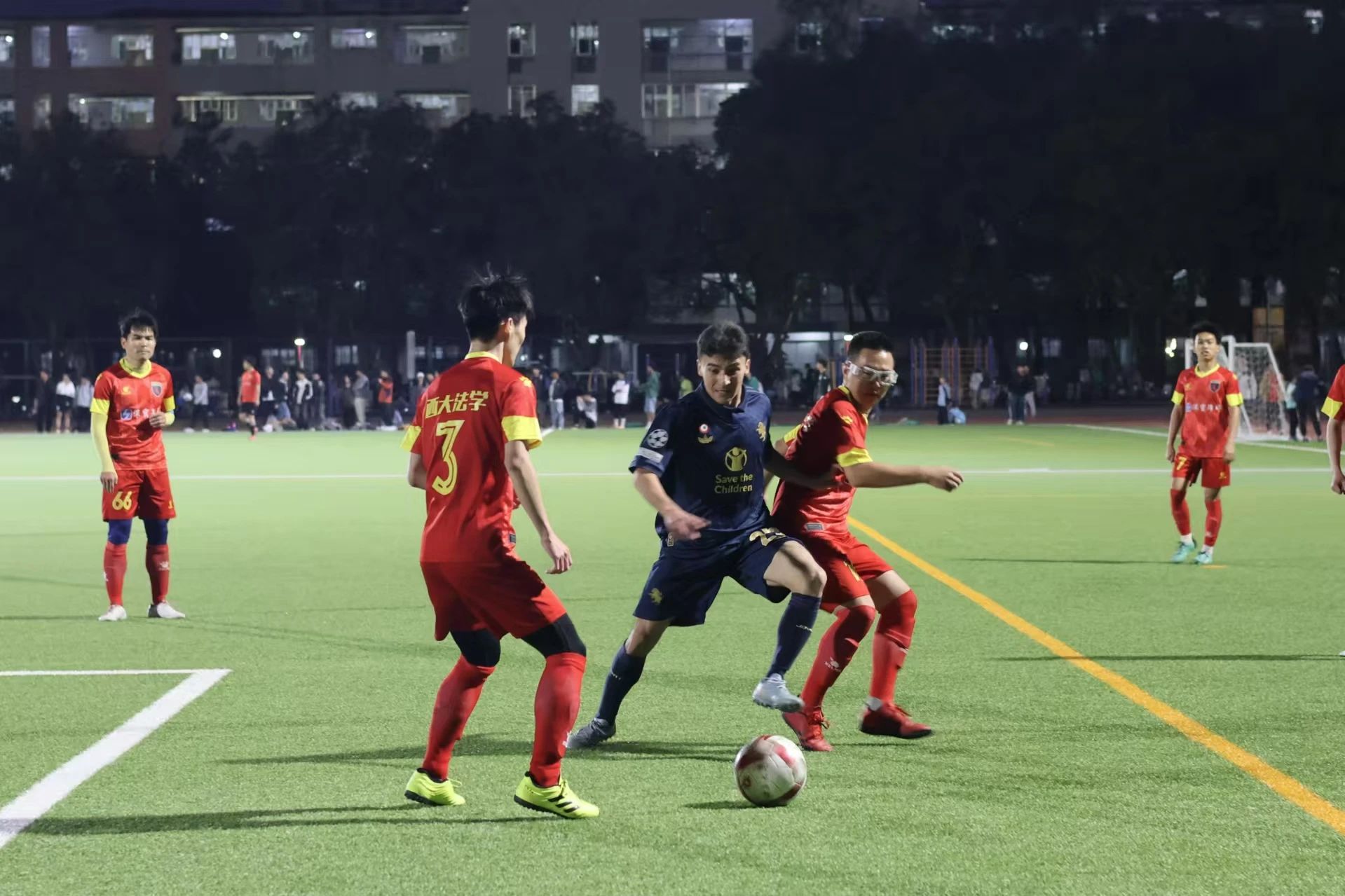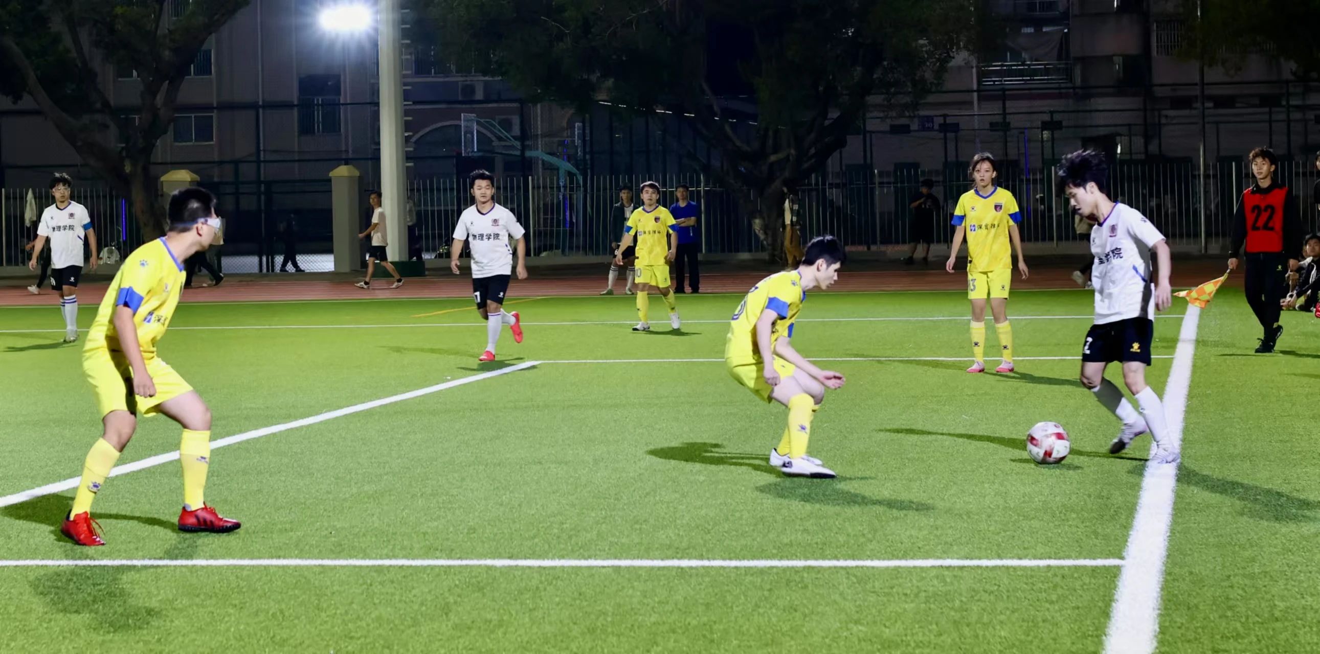 11月25日晚,我院队员迎战新闻与传播学院。当哨声响起,所有人快速进入状态,相互配合,在进攻与防守之间巧妙转换。上半场双方打得旗鼓相当,状况焦灼。比赛第23分钟,对方球员将我方防守队员晃倒在地,成功踢进一球。下半场,面临对手的强攻,我院的球员们毫不畏惧,勇往直前。赛场上,球员们奔跑的身姿充分展示着他们拼搏的热情,法学院最终惜败新闻与传播学院。但队员们努力与拼搏值得认可,感谢你们为法学院争光!