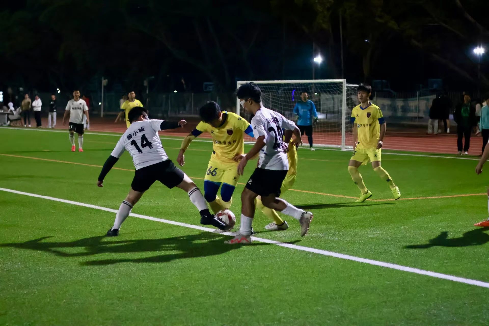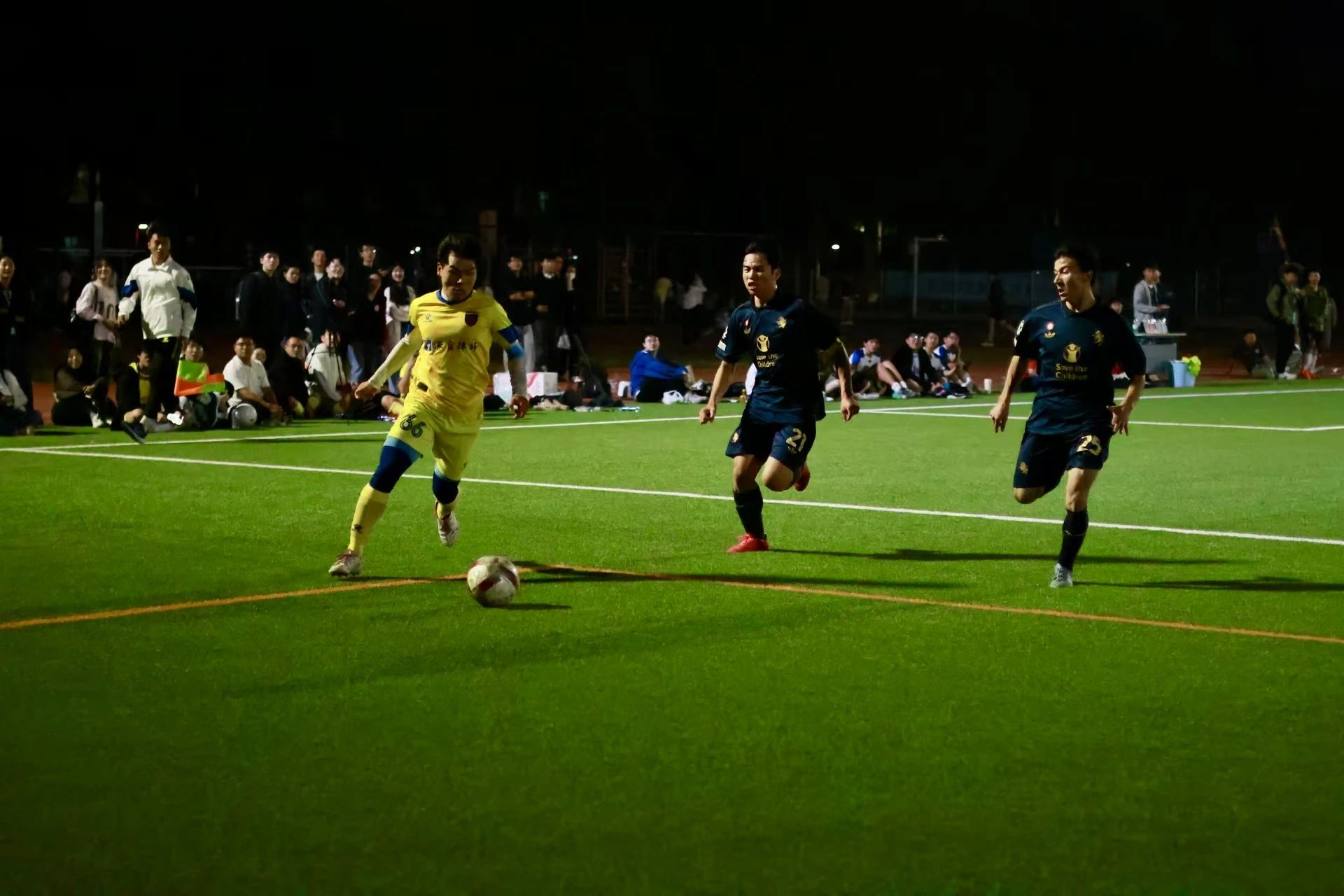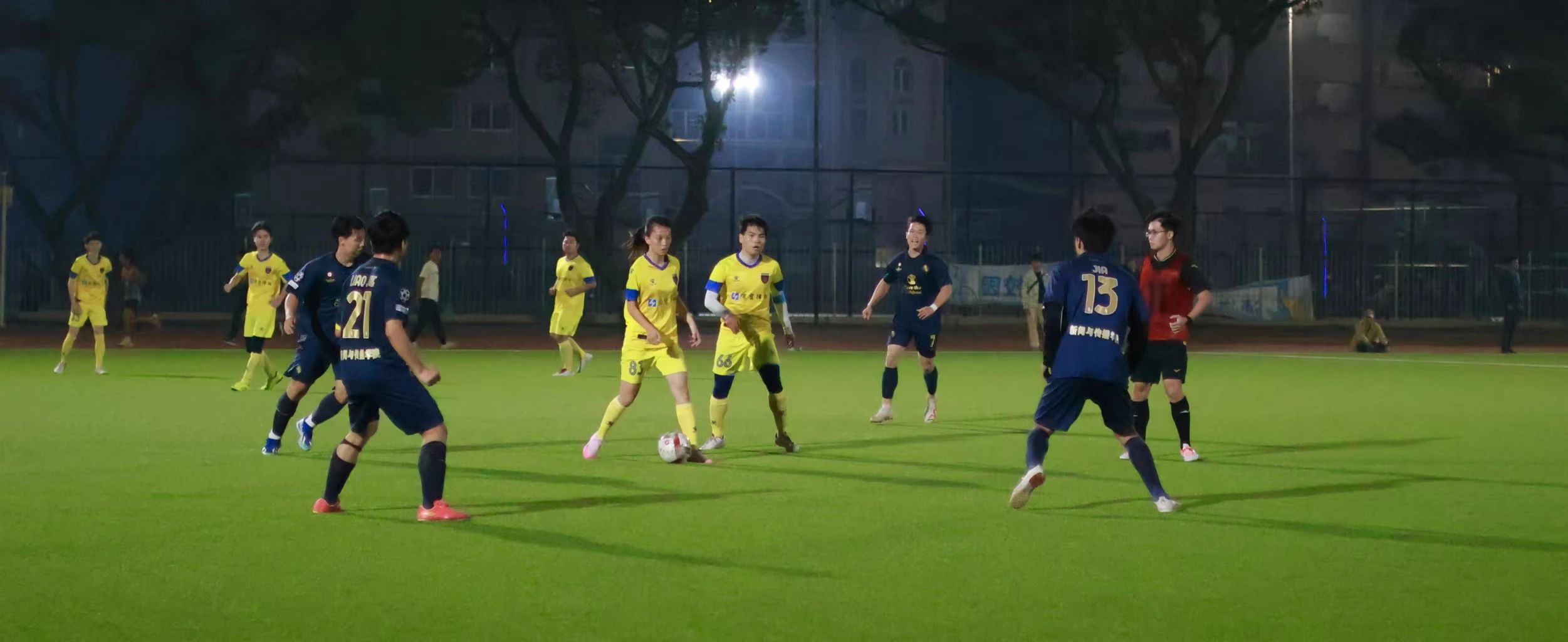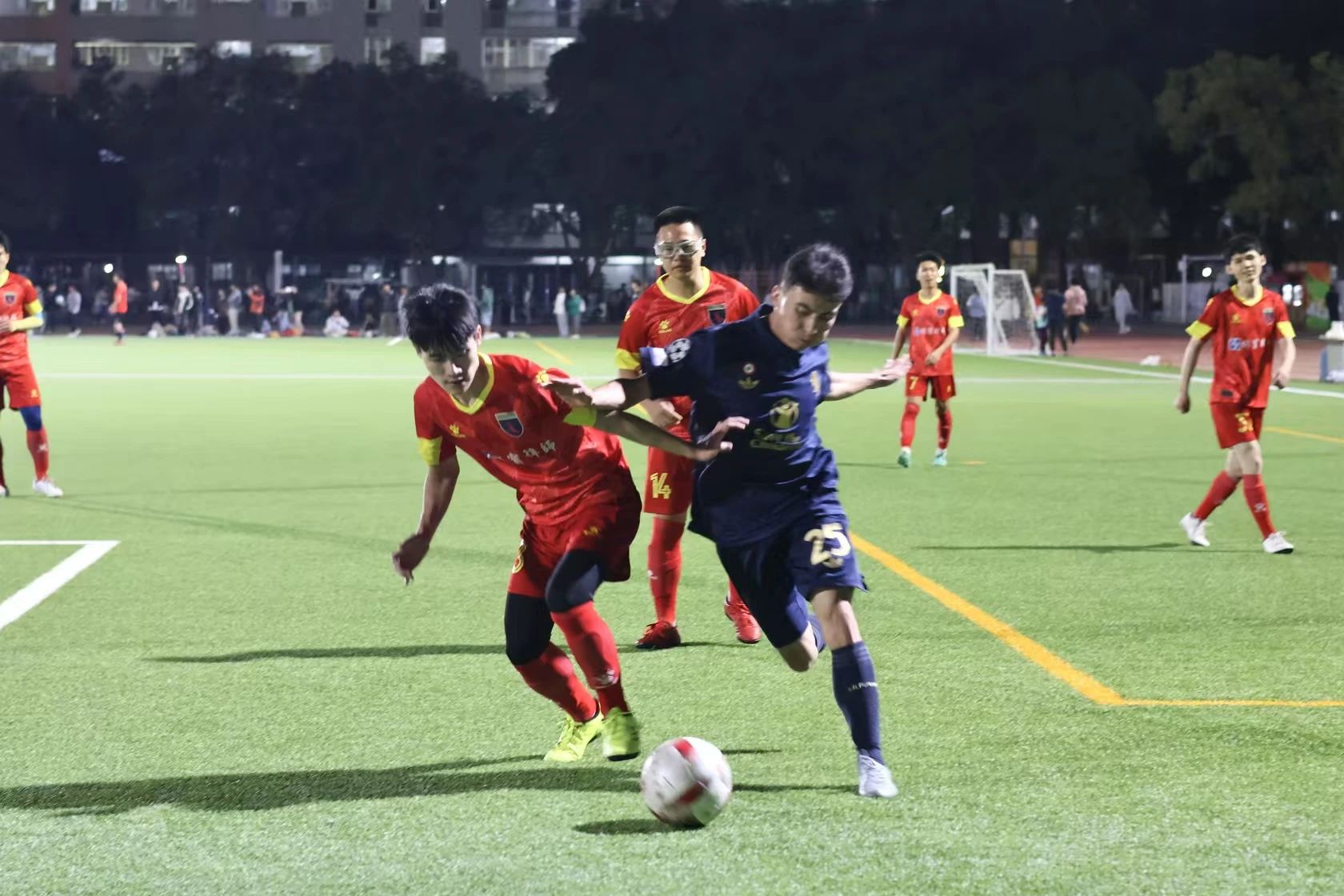 11月25日晚,我院队员迎战新闻与传播学院。当哨声响起,所有人快速进入状态,相互配合,在进攻与防守之间巧妙转换。上半场双方打得旗鼓相当,状况焦灼。比赛第23分钟,对方球员将我方防守队员晃倒在地,成功踢进一球。下半场,面临对手的强攻,我院的球员们毫不畏惧,勇往直前。赛场上,球员们奔跑的身姿充分展示着他们拼搏的热情,法学院最终惜败新闻与传播学院。但队员们努力与拼搏值得认可,感谢你们为法学院争光!
