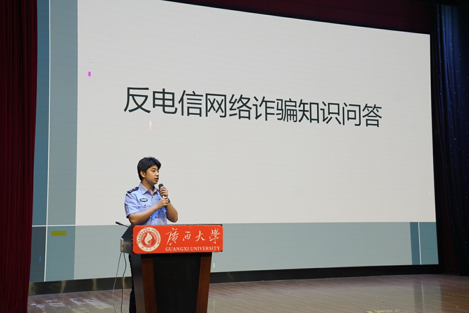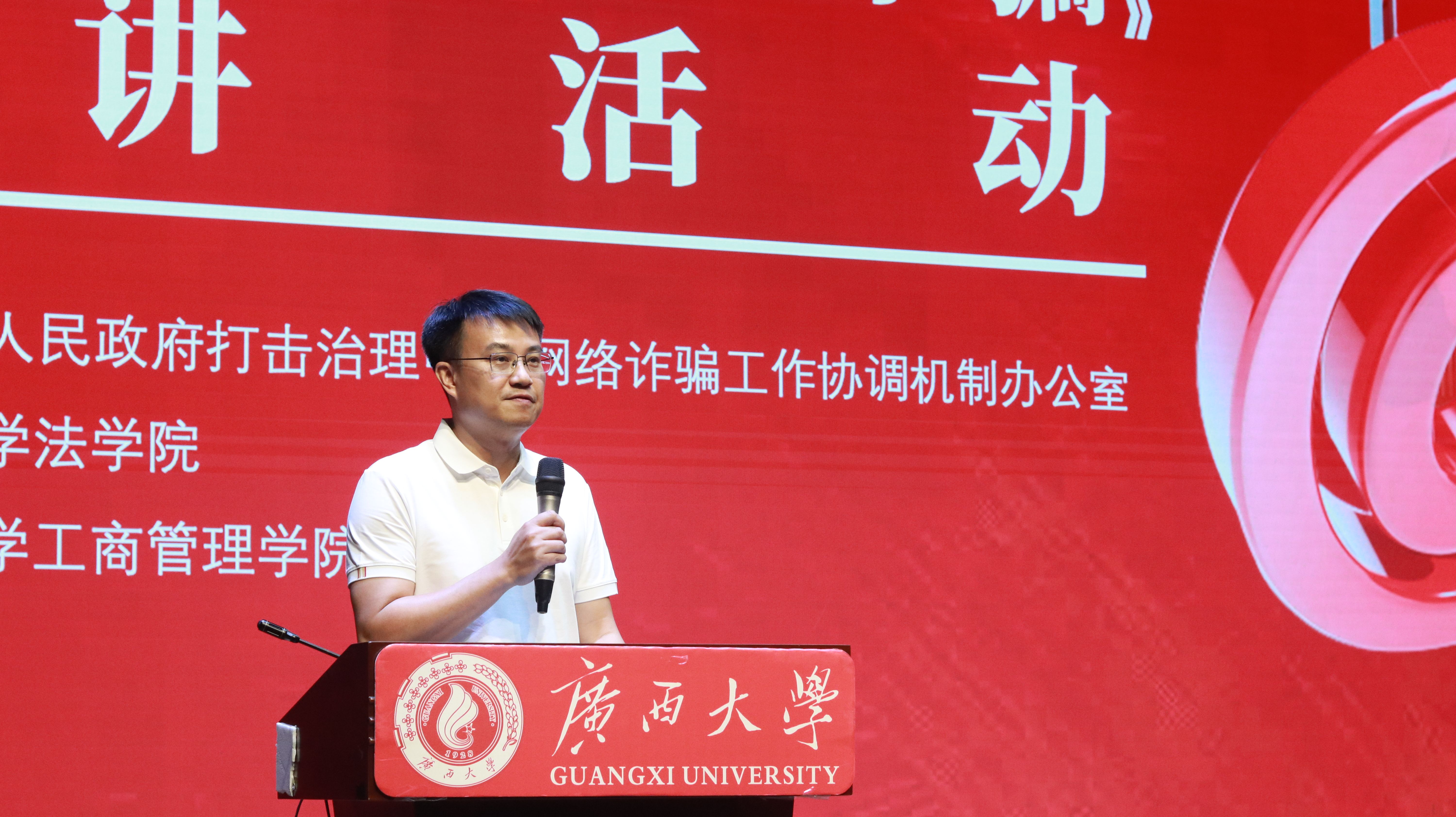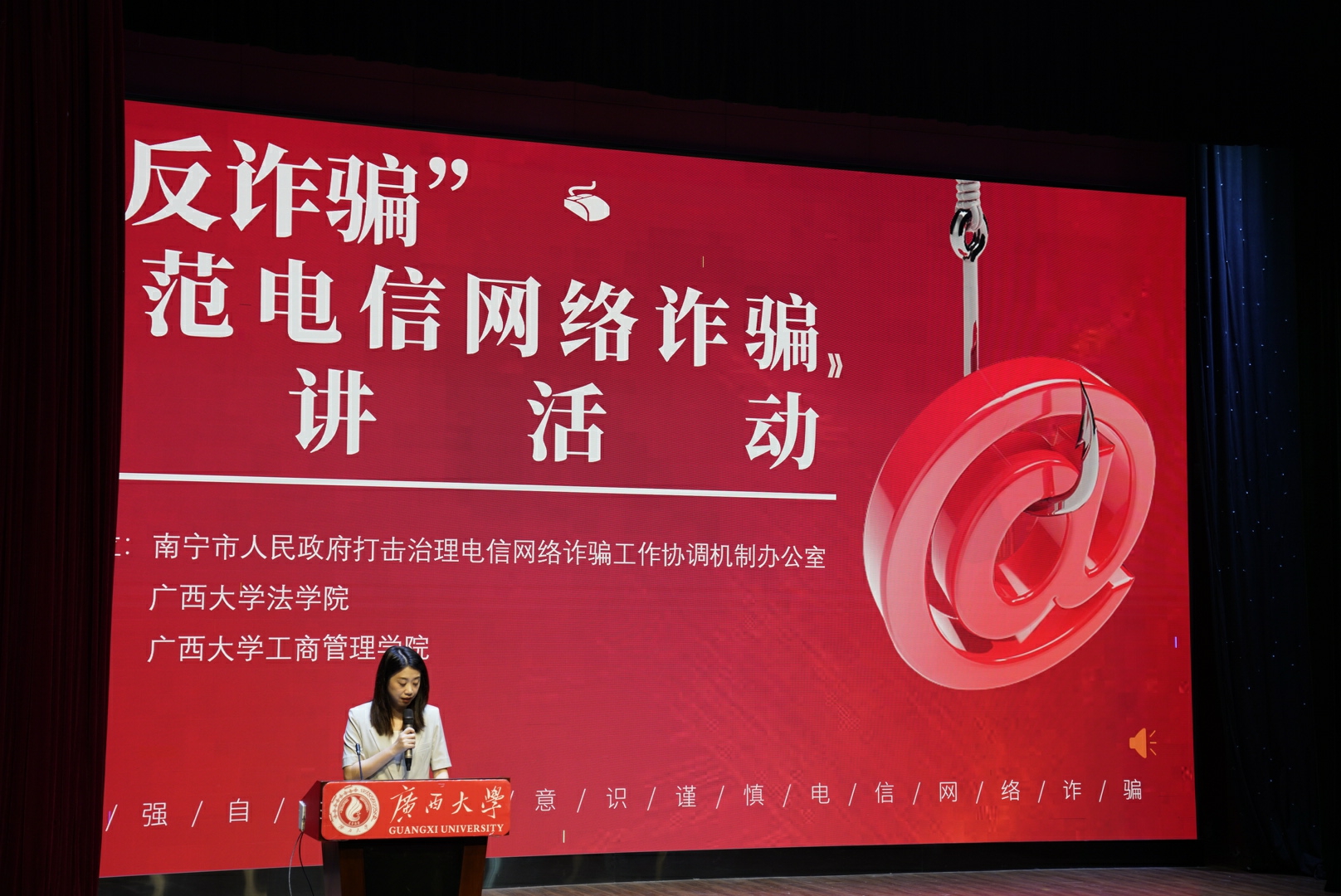 为进一步强化校园反诈宣传教育实效,切实提升广大师生防范电信网络诈骗的意识和能力,有效守护师生财产安全,4月14日下午,由南宁市人民政府打击治理电信网络诈骗工作协调机制办公室、广西大学法学院、广西大学工商管理学院联合主办的防范电信网络诈骗宣讲活动,在广西大学大学生活动中心小剧场成功举办。广西大学法学院党委书记余云宇,工商管理学院党委副书记、纪委书记肖克宁,保卫处副处长陈宏,以及南宁市公安局网侦支队预警反制大队大队长谭伟、副大队长黎彦辰出席活动,活动由广西大学法学院党委委员、副院长刘馨元主持。法学院、工商管理学院师生代表参加活动,互动交流积极,宣讲活动取得了良好的宣传教育效果。