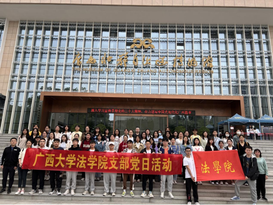 为深入学习贯彻党的二十大精神,热烈庆祝全国两会胜利召开,团结引领法学院党员同志感党恩、听党话、跟党走,赓续文化根脉,奋进新时代。3月8日下午,我院本科生党支部联合开展“学习历史文化,坚定文化自信”主题党日活动,组织支部同志到广西壮族自治区博物馆参观学习,弘扬优秀传统文化。