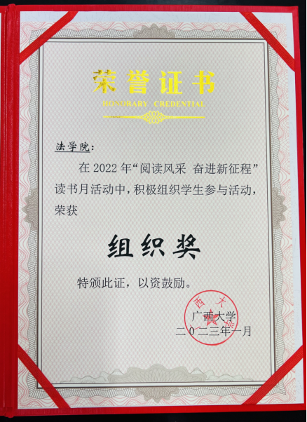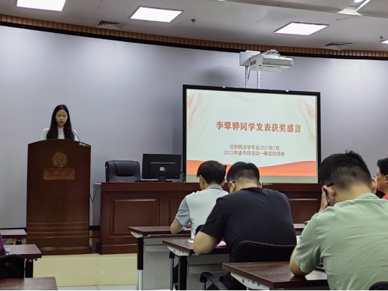 活动伊始,王承就馆长发表讲话并宣读表彰文件,随后与会领导为获奖者颁发荣誉证书。本次读书月活动中,法学院积极组织学生参与,荣获读书月活动优秀组织奖;我院学生共获一等奖2项,二等奖2项,三等奖5项,阅读达人奖7项,我院本科2021级1班李翠骅同学作为读书月活动一等奖获奖代表上台发言。活动最后,教务处潘莹副处长为本次活动作出总结,希望同学们常读书、读好书并将所读知识学以致用。