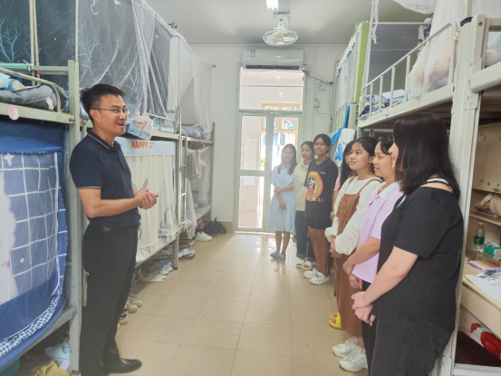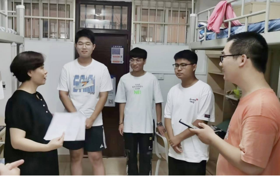 在宿舍里,老师们与新生及部分新生家长亲切交谈。党委书记余云宇老师向新生表达了热烈欢迎和亲切关怀。为缓解学生对家的思念,老师们鼓励新生介绍自己的家乡习俗,分享来校经历,帮助同学们及时调整状态,更好地适应新环境,并叮嘱学生遇到学习或生活问题要及时向老师和同学们寻求帮助。随后,老师又勉励新生:大家来自五湖四海,怀着共同的理想相遇在这里,在日后的学习和生活中要互相理解,互相帮助,共同进步,创造美好的大学生活。与家长交流时,余书记请家长放心,学校会帮助新生尽快适应大学生活,培养学生独立学习生活的能力。同学们深切感受到了老师们的期盼和关怀,纷纷表示将会牢记老师们的嘱托,不负青春韶华,努力提升自我。