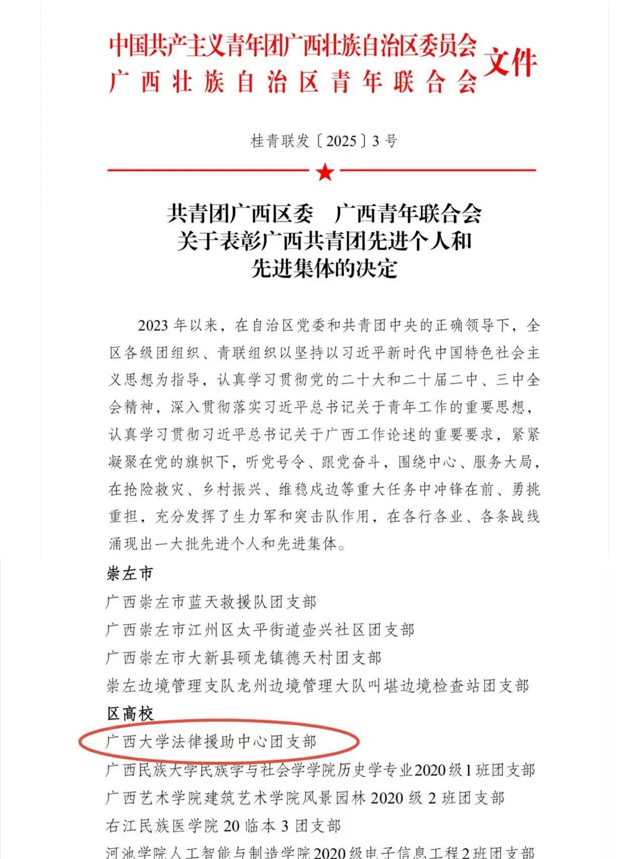 近日,共青团广西区委、广西青年联合会开展表彰工作,对一批表现优异的先进集体与个人予以表彰。“广西五四红旗团支部”“广西优秀共青团员”作为广西共青团设立的重要荣誉奖项,旨在褒奖在工作、学习领域表现突出、取得显著成绩的基层团组织与个人。广西大学法律援助中心团支部凭借志愿服务方面的突出表现,荣获“广西五四红旗团支部”称号。
