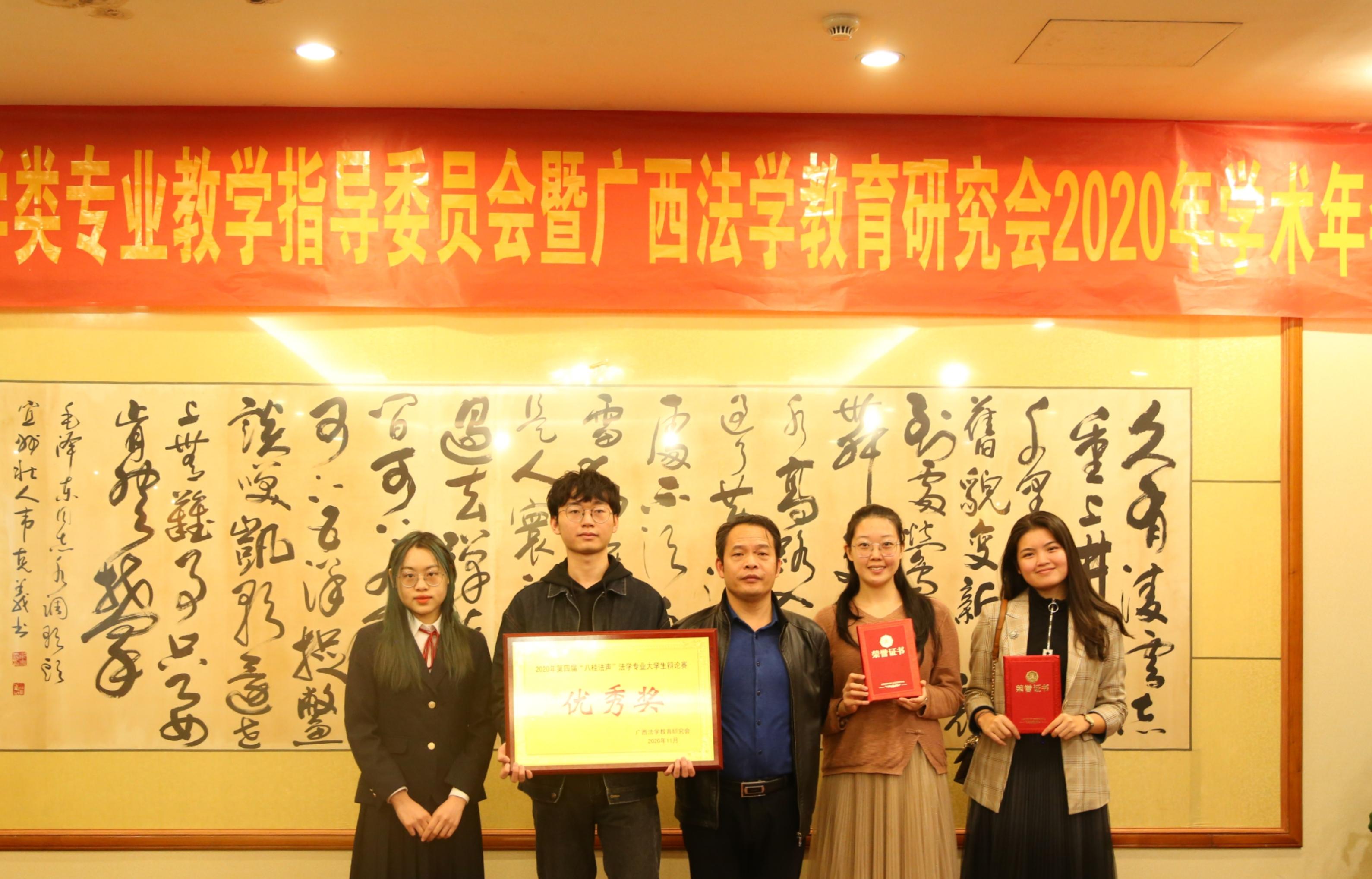 2020年11月27日,广西十所高校在南宁明园新都酒店共同举行了广西高校第四届“八桂法声”法学专业辩论赛和第一届“八桂法声”法学专业大学生演讲比赛,并于11月28日上午举行了广西法学教育研究会2020年学术年会和颁奖典礼。该活动旨在加强广西的法学教育、提高专业教学水平、创新法治人才培养机制、培养卓越法治人才。在我院梁建新教授的指导下,我校法学院代表队成绩喜人。