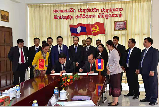 赵跃宇校长与老挝最高人民检察院人事局松奔·拉沙波习(前左三)局长签署合作谅解备忘录。(聂资鲁院长后排左第一)