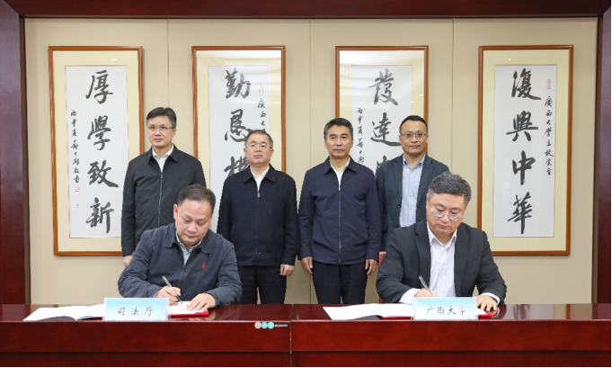12月17日,自治区司法厅与广西大学合作共建签约仪式在我校举行。自治区政协副主席、校党委书记王乃学,自治区司法厅党委书记、厅长林金文先后致辞,副校长田利辉与司法厅副厅长张军分别代表双方签订合作框架协议。