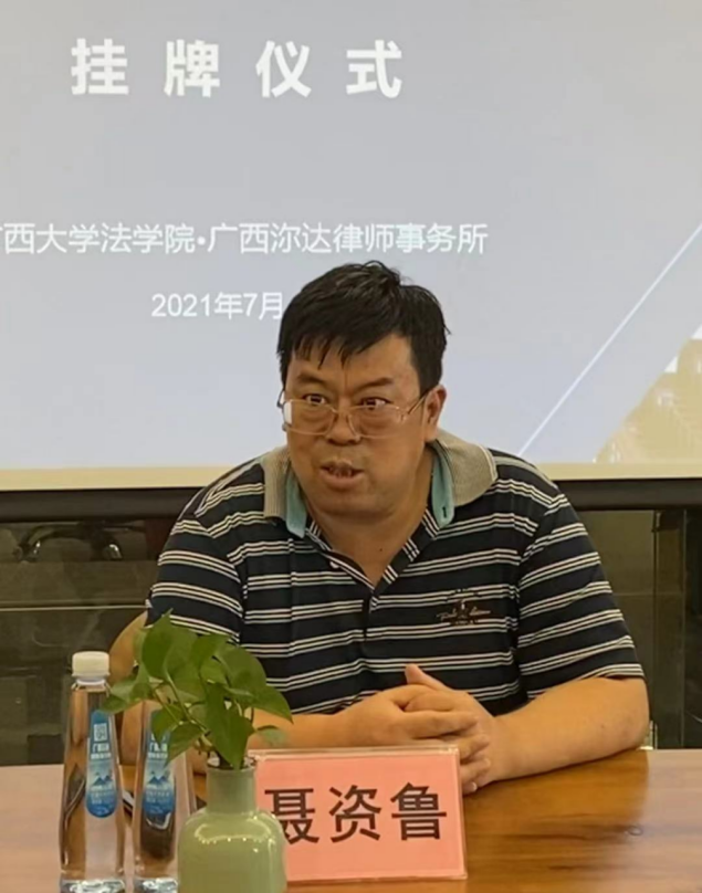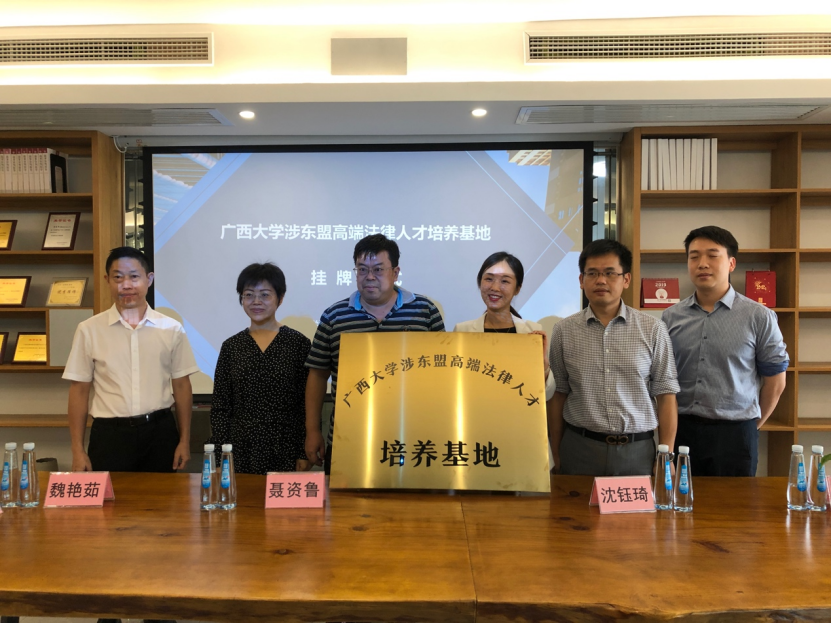 2021年 7月13日下午, 广西大学法学院院长聂资鲁教授一行4人到访 广西 沵 达律师事务所 ,双方成功举行全面合作洽谈会,并举行了隆重的广西大学涉东盟高端法律人才培养基地挂牌仪式。