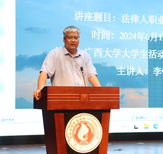 6月12日晚,由我院主办的“法务引航”之职业规划系列讲座在广西大学大学生活动中心一楼小剧场举行。本次讲座由小米集团知识产权诉讼组法务总监李锐主讲,深入探讨法律人职业规划与选择,吸引了我院本科生、研究生参与,法学院院长许光耀主持讲座。