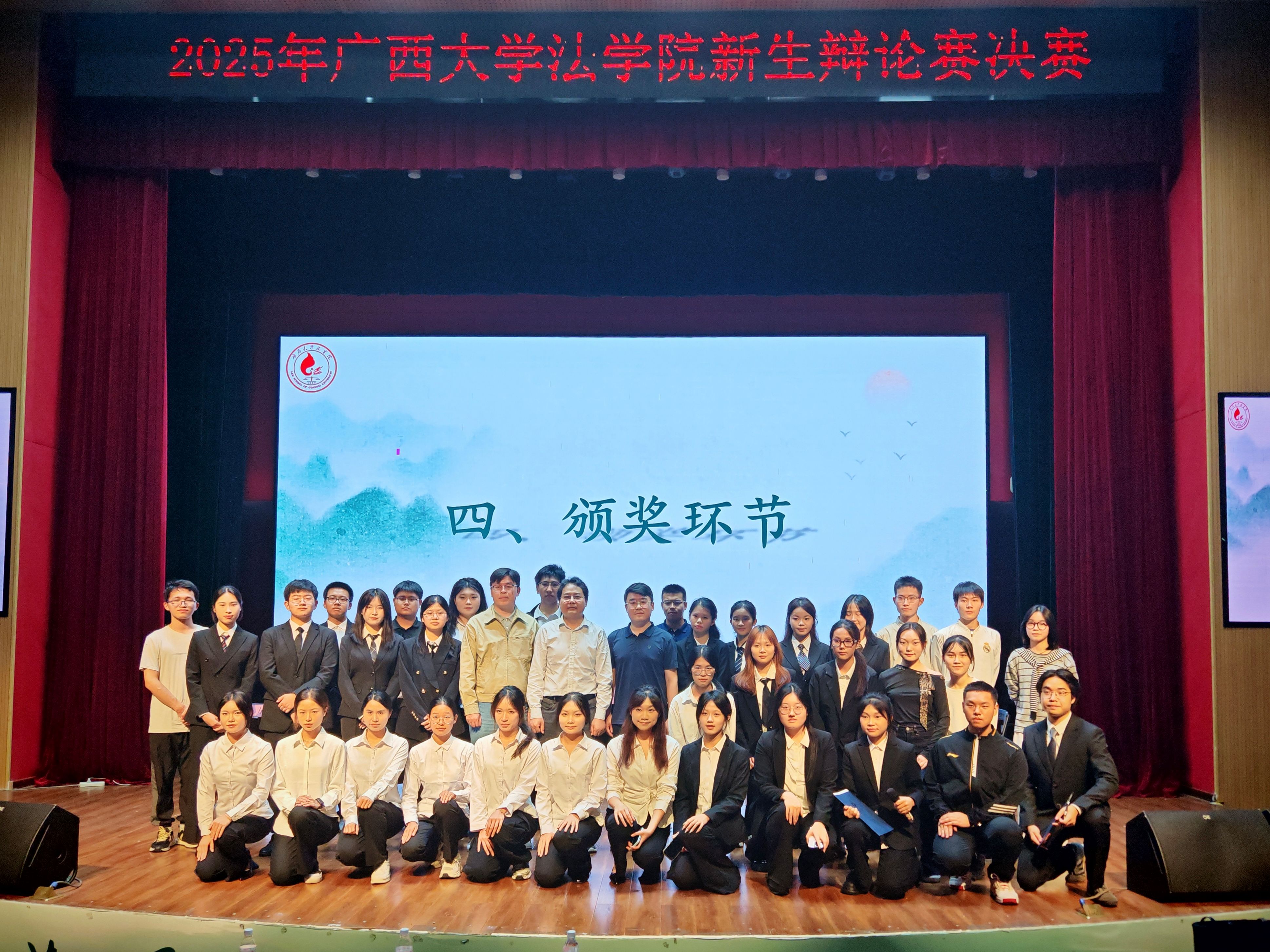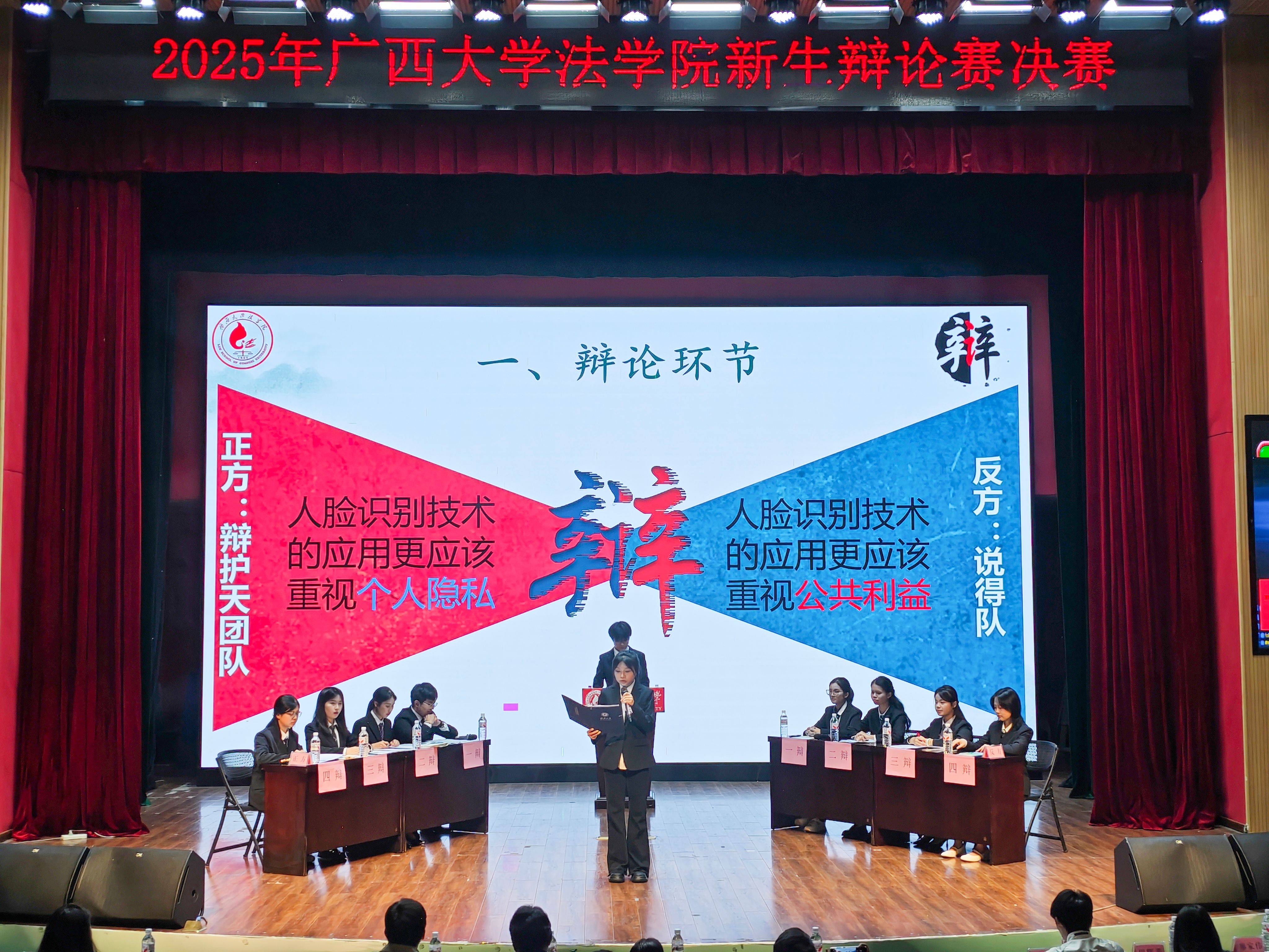 为进一步丰富校园文化生活,提升学生思辨能力与专业素养,2025年11月16日晚,广西大学法学院新生辩论赛决赛在大学生活动中心一楼小剧场隆重举行,法学院党委副书记韦兴剑、副院长熊超、团委书记申孟鑫、教师代表孔忠愿出席此次活动。本次决赛的辩题为“人脸识别技术的应用更应该重视公共利益还是个人隐私”,吸引了近百名师生到场观看。经过前期多轮激烈角逐,“辩护天团队”与“说得队”脱颖而出,晋级决赛。比赛现场气氛紧张热烈,双方辩手围绕这一具有时代意义的辩题展开激烈交锋,争夺最终的冠军。