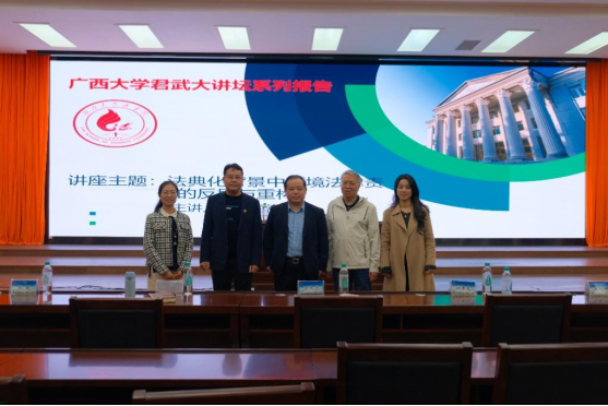 2024年12月7日下午,以“环境法律责任的反思与重构”为主题的专家讲座在广西大学君武馆玉林厅成功举办。本次讲座有幸邀请到武汉大学法学院教授陈海嵩主讲,我院副院长熊超副教授主持,张洪涛教授、刘旭博士、梁春艳博士以及法学院众多学子共同聆听了本场讲座。